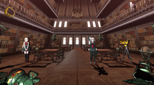 Welcome to the library! Hajime is looking through the shelves for something to read, making increasingly frustrated noises because everything's in English.